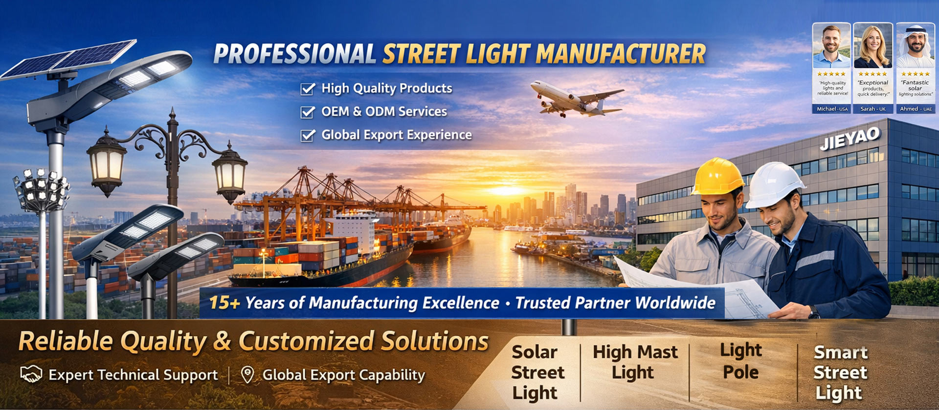 At JIEYAO Lighting, we provide more than street lights — we deliver reliable outdoor lighting solutions you can trust. With over 7 years of manufacturing and export experience, we have served clients in 80+ countries, supporting municipal, infrastructure, and commercial projects worldwide.